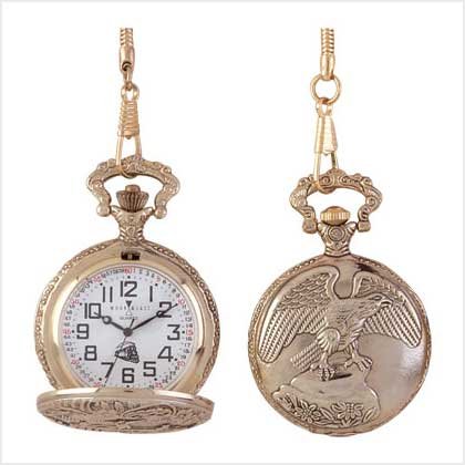 "An embossed eagle graces this vintage Quartz pocket watch that comes complete with a distinctive fob chain. 1 3/4"" diameter. "