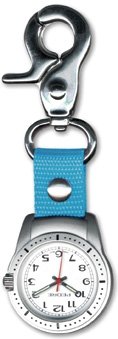 Pedre's unisex clip-on watch features a quartz movement accurate to within one minute per year. Matte silver finish case, turquoise nylon strap, and white dial. Water resistant to 100 feet. Looks great attached to a belt loop or a backpack!